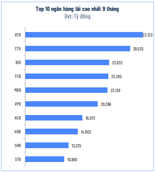 Các vị trí còn lại trong top 10 ngân hàng lãi cao nhất vẫn thuộc về ACB (+5%), HDB (+17%), SHB (+35%) và STB (+36%).