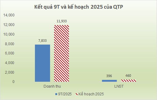 Lũy kế 9 tháng đầu năm, QTP đạt hơn 7.8 ngàn tỷ đồng doanh thu thuần, giảm 13% so với cùng kỳ; lãi sau thuế đạt hơn 396 tỷ đồng, giảm 15%. Dù đi lùi nhưng so với kế hoạch từ ĐHĐCĐ 2025, tình hình của QTP vẫn ổn định khi thực hiện được 66% mục tiêu doanh thu và 86% kế hoạch lãi sau thuế.