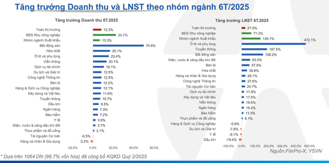 Trong đó, nhóm phi tài chính tiếp tục dẫn đầu đà tăng trưởng 4 quý liên tiếp với mức tăng trưởng 41,7% trong quý II/2025. Đặc biệt, dù chịu tác động trực tiếp từ thuế quan, nhưng nhóm xuất khẩu và bất động sản khu công nghiệp vẫn duy trì đà tăng trưởng lợi nhuận sau thuế lần lượt là 153,6% và 63%.