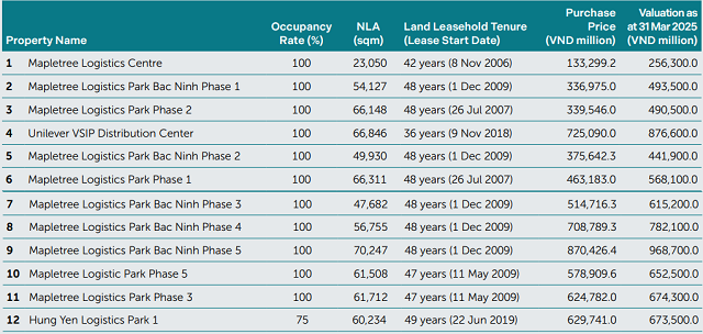Tại Việt Nam, báo cáo của Mapletree Logistics Trust (MLT) – “cánh tay” quản lý tài sản logistics của Tập đoàn, cho thấy nhiều dự án đã nhanh chóng đạt tỷ lệ lấp đầy cao. Điển hình như Mapletree Logistics Park Phase 3 và Hung Yen Logistics Park I – 2 dự án MLT nhận chuyển nhượng từ Mapletree trong năm 2024 – với hơn 120,000m2 sàn đã đạt tỷ lệ lấp đầy từ 95-100% tính đến tháng 7/2025 và suất sinh lời ban đầu 7.5%, cao hơn hẳn mức 5.7% ở Malaysia.