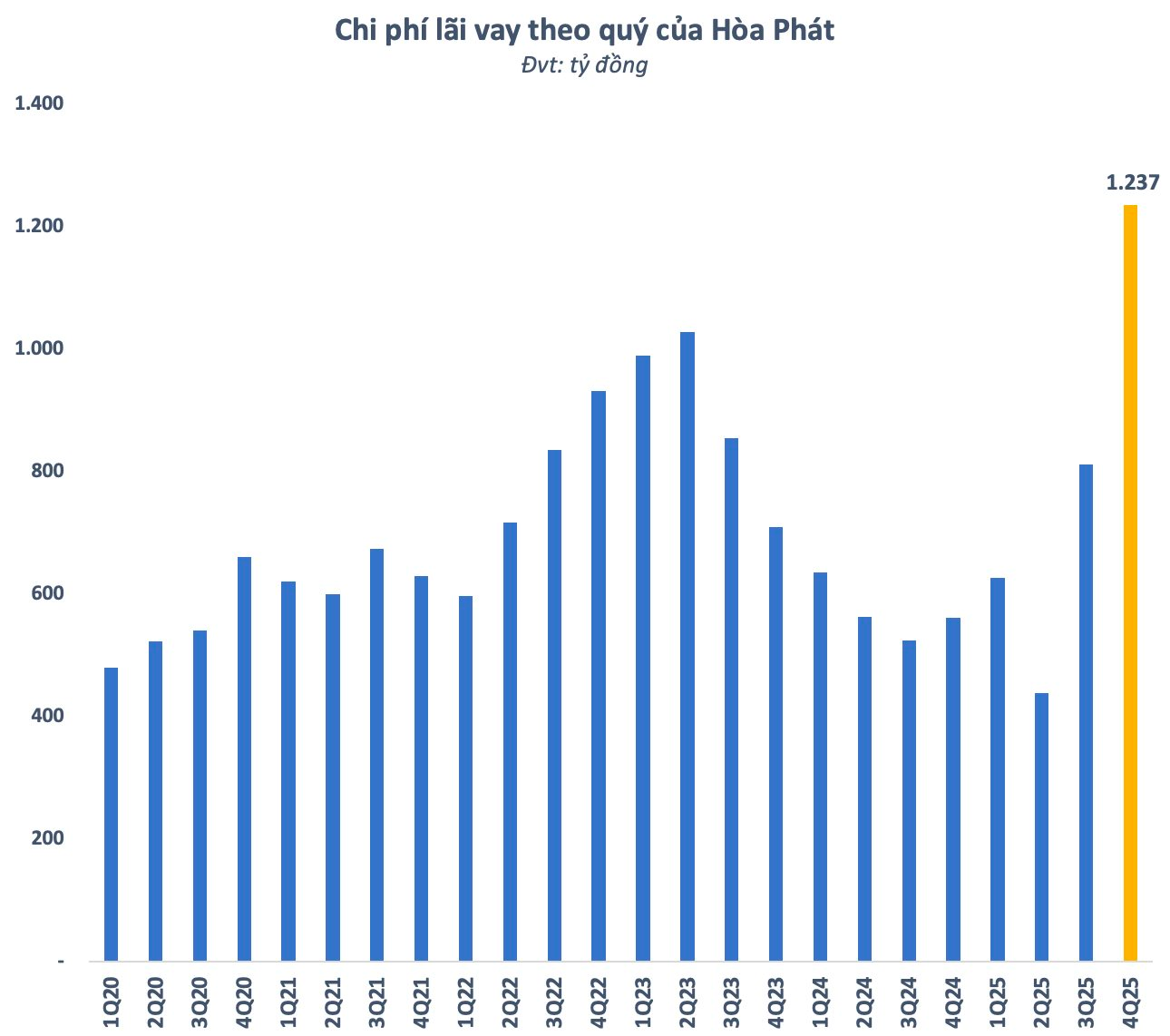 Theo giải trình từ phía Hòa Phát, nguyên nhân khiến chi phí lãi vay tăng vọt trong quý 4 dù dư nợ vay tài chính giảm chủ yếu do dừng vốn hóa sau khi Dung Quất 2 chính thức đi vào hoạt động và mặt bằng lãi suất cho vay VND cuối năm 2025 cũng tăng cao so với đầu năm.