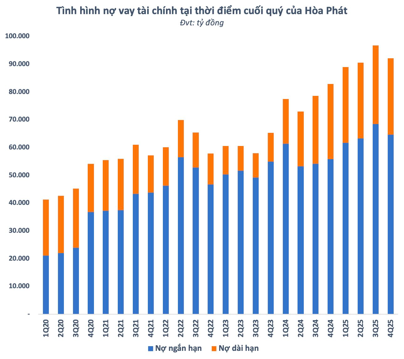 Thời điểm 31/12/2025, tổng dư nợ vay của Hòa Phát ở mức hơn 92.000 tỷ đồng, giảm nhẹ so với mức cuối quý 3 trước đó do bắt đầu đi vào kỳ trả nợ khoản vay tài trợ cho dự án Dung Quất 2. Tính chung cả năm 2025, dư nợ vay tăng hơn 9.200 tỷ so với thời điểm cuối năm 2024. Sự gia tăng này chủ yếu đến từ việc giải ngân các khoản vay trung và dài hạn nhằm tài trợ cho các dự án đầu tư đang triển khai, đặc biệt là Dự án Khu liên hợp gang thép Hòa Phát Dung Quất 2.