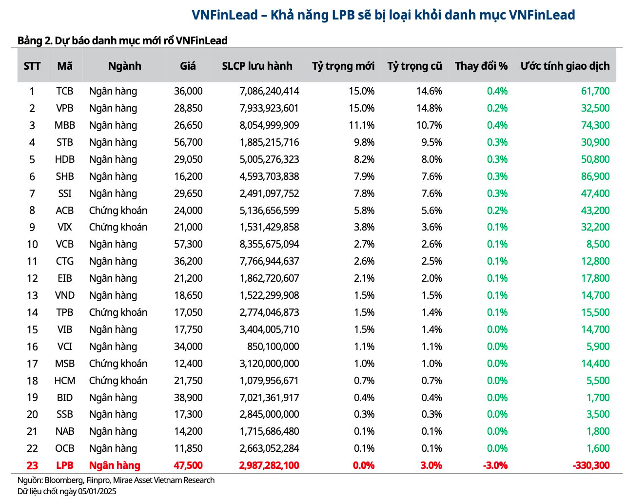 Việc loại LPB dự kiến sẽ khiến số lượng cổ phiếu thành phần của VNFin Lead giảm xuống còn 22 mã, bao gồm 17 cổ phiếu ngân hàng và 5 cổ phiếu chứng khoán. Hiện nay, các cổ phiếu chiếm tỷ trọng vốn hóa lớn nhất trong chỉ số này là TCB (15%), VPB (15%) và MBB (11,1%).