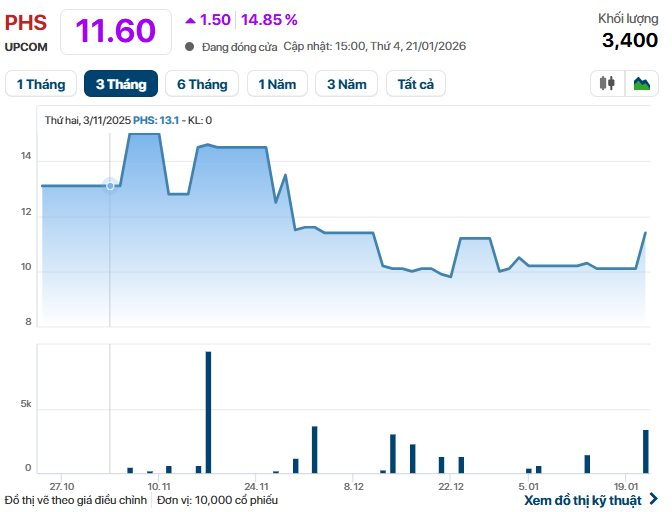 Cổ phiếu này tăng kịch trần, trắng bên bán, lên mức 11.600 đồng/cp. Tuy nhiên, thanh khoản vẫn khá khiêm tốn khi chỉ có khoảng 3.400 cổ phiếu được sang tay trong phiên. Dù bật tăng mạnh, thị giá PHS hiện vẫn thấp hơn khoảng 26% so với vùng đỉnh gần nhất thiết lập vào tháng 8.