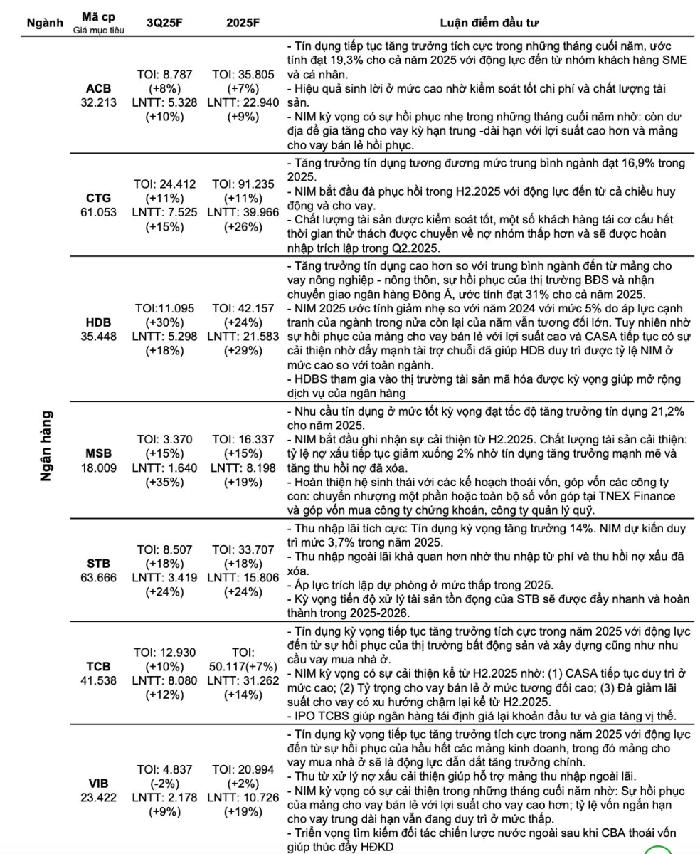 Trong nhóm ngân hàng, BID được dự báo tăng trưởng lợi nhuận 14% trong quý 3/2025, đạt mức 7.380 tỷ đồng. Tăng trưởng tín dụng dự báo đạt 16%, tương đương mức trung bình ngành, trong khi biên lãi ròng (NIM) đi ngang ở mức 2,4%. BIDV tiếp tục duy trì chất lượng tài sản thuộc nhóm tốt nhất ngành với áp lực trích lập dự phòng thấp. Đáng chú ý, ngân hàng này sẽ tăng vốn điều lệ thêm 21.656 tỷ đồng, nâng quy mô vốn điều lệ lên gần 91.870 tỷ đồng, thông qua các phương án: tăng vốn từ quỹ dự trữ bổ sung vốn điều lệ 7,1%, trả cổ tức bằng cổ phiếu với tỷ lệ 19,9% và phát hành riêng lẻ với tỷ lệ 3,84%.