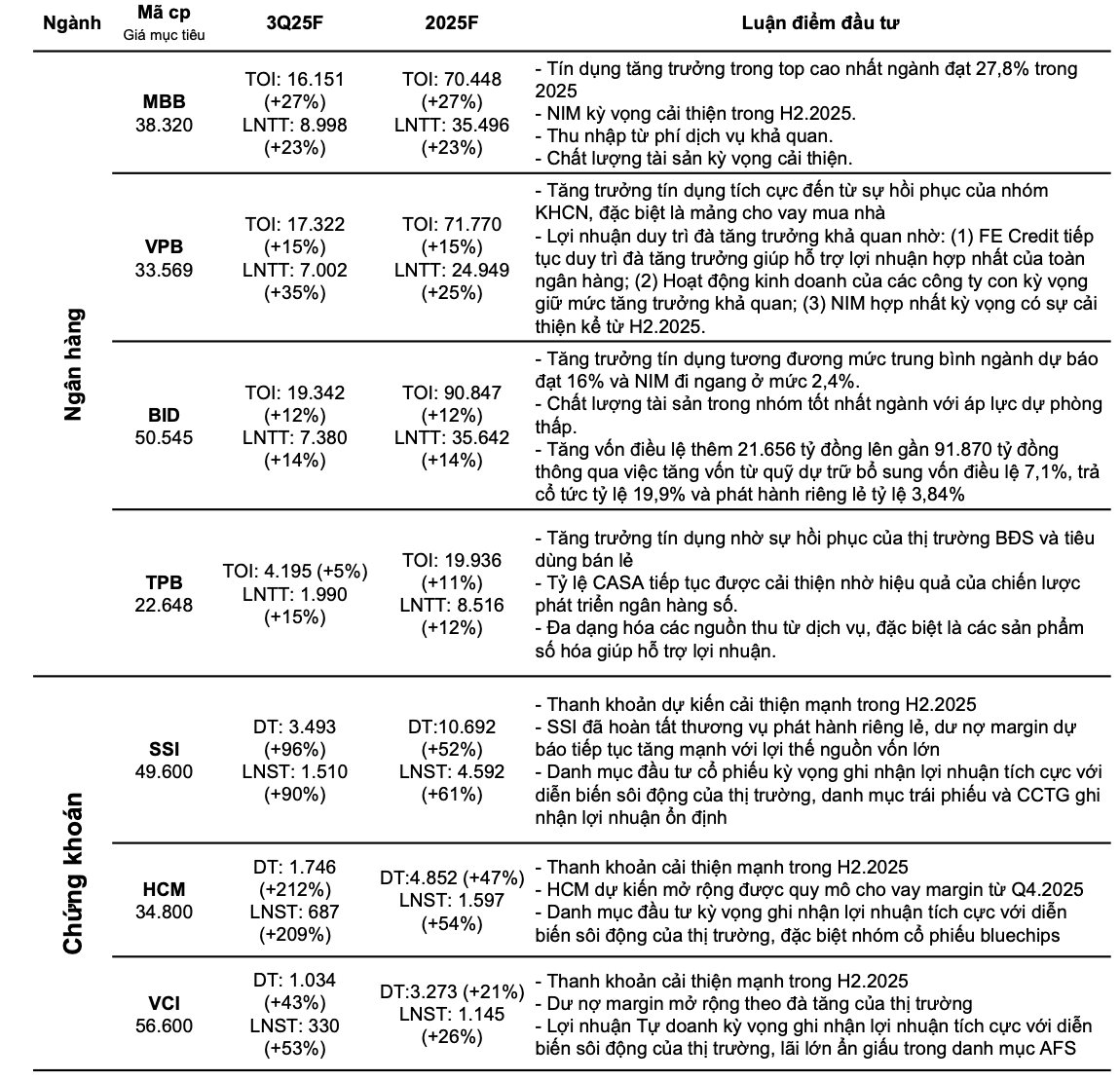 Đối với Chứng khoán SSI, doanh thu dự kiến đạt 3.493 tỷ đồng và lợi nhuận sau thuế đạt 1.510 tỷ đồng, đều tăng trên 90% so với cùng kỳ năm trước. Tương tự HCM, động lực tăng trưởng của SSI cũng đến từ thanh khoản thị trường cải thiện mạnh trong nửa cuối năm 2025. Ngoài ra, công ty đã hoàn tất thương vụ phát hành riêng lẻ, qua đó có lợi thế về nguồn vốn lớn để tiếp tục mở rộng dư nợ ký quỹ. Danh mục đầu tư cổ phiếu được kỳ vọng ghi nhận lợi nhuận tích cực với diễn biến thị trường sôi động, trong khi danh mục trái phiếu và chứng chỉ tiền gửi (CCTG) mang lại nguồn thu nhập ổn định.
