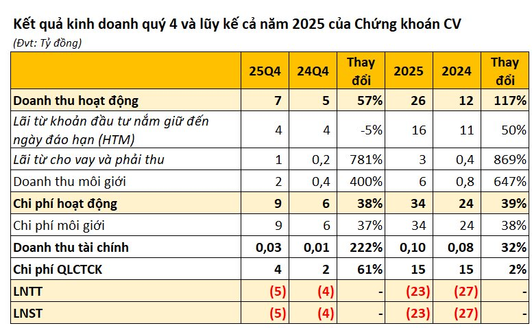Lũy kế cả năm 2025, CVS đạt gần 26 tỷ đồng doanh thu hoạt động, tăng trưởng mạnh 117% so với cùng kỳ năm trước. Tuy vậy, công ty chứng khoán này lỗ trước thuế hơn 23 tỷ đồng, tích cực hơn khoản lỗ 24 tỷ trong cùng kỳ năm 2024.