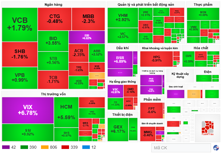 Trên bản đồ thị trường, 432 mã tăng giá, bao gồm 42 mã tăng trần, cho thấy ưu thế hơn so với 351 mã giảm giá, trong đó có 12 mã giảm sàn. Đóng góp nhiều điểm nhất cho VN-Index hôm nay là VIC với 7.08 điểm, tiếp đến là GAS 3.67 điểm, VHM 3.41 điểm, BID 2.7 điểm, VCB 2.35 điểm.