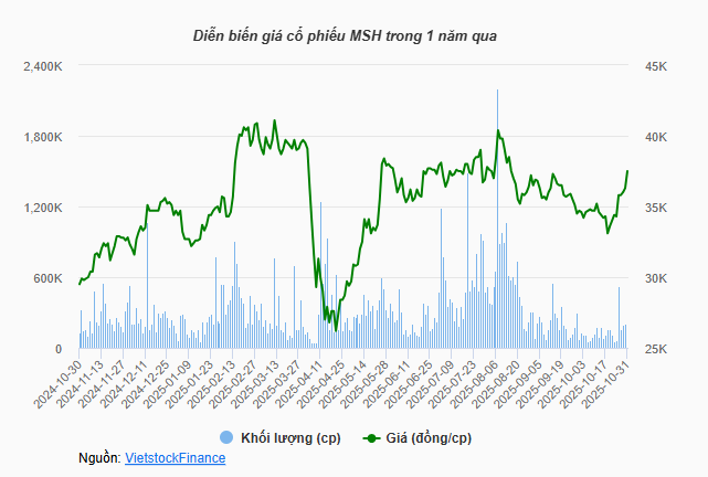 Trên sàn HOSE, cổ phiếu MSH đang giao dịch ở mức 36,300 đồng/cp, tăng hơn 5% trong tuần qua và cao hơn 22% qua 1 năm, với thanh khoản bình quân hơn 300,000 cp/phiên.
