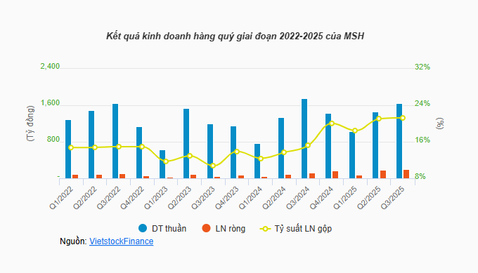 Tính chung 9 tháng đầu năm, MSH ghi nhận doanh thu gần 4,150 tỷ đồng, tăng 8% so với cùng kỳ và thực hiện được 83% kế hoạch năm. Lợi nhuận ròng đạt gần 427 tỷ đồng, tăng 64% và vượt mức lãi ròng cả năm 2024 (413 tỷ đồng). Riêng mảng tài chính đem về hơn 172 tỷ đồng, tăng 17%.