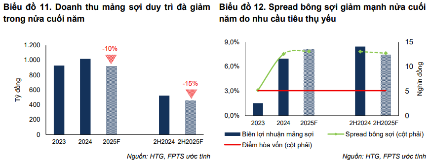 Cụ thể, doanh thu mảng sợi năm 2025 dự kiến giảm 10% so với năm trước đạt 919 tỷ đồng dựa trên giả định sản lượng nửa cuối năm giảm mạnh khi hoạt động sản xuất hàng may mặc các quốc gia châu Á ảm đạm. Nguyên nhân đến từ xuất khẩu may mặc của các quốc gia may mặc châu Á cũng phụ thuộc vào thị trường Mỹ, sụt giảm trong nửa cuối năm tương tự mảng may mặc của Việt Nam.