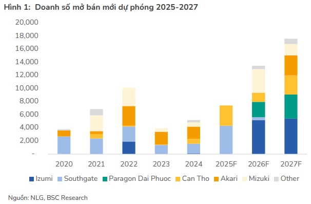 CTCK BIDV (BSC) dự báo doanh số mở bán mới của CTCP Đầu tư Nam Long (HOSE: NLG) sẽ đạt mức tăng trưởng 54% CAGR trong giai đoạn 2025-2027 khi doanh nghiệp đẩy mạnh tiến độ mở bán mới để triển khai Izumi và Paragon Đại Phước.