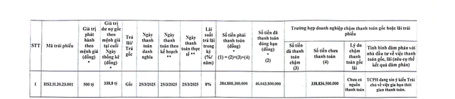 Cụ thể, theo kế hoạch, ngày 25/3/2025, doanh nghiệp phải thanh toán gần 385 tỷ đồng tiền gốc trái phiếu HS2.H.20.23.001.