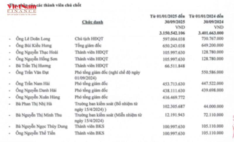 Cụ thể, Tổng giám đốc Bùi Kiều Hưng nhận thu nhập 650,24 triệu đồng, tăng nhẹ 0,16% so với cùng kỳ; Chủ tịch HĐQT Lê Doãn Long nhận 597 triệu đồng, giảm 18,3%; Phó tổng giám đốc Trần Nam Hải nhận 453,7 triệu đồng, tăng 1,38%; và Phó tổng giám đốc Nguyễn Danh Hải nhận 438,1 triệu đồng, giảm 0,36%.