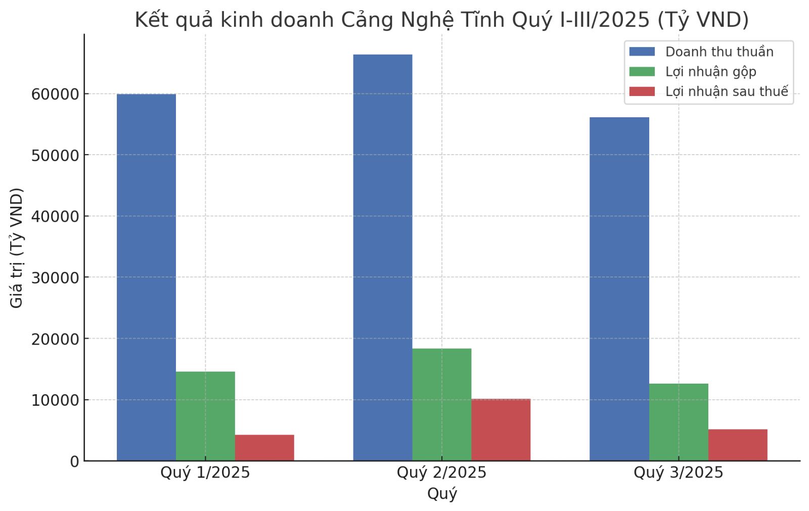 Trong quý III/2025, Công ty Cổ phần Cảng Nghệ Tĩnh (Cảng Nghệ Tĩnh) đạt doanh thu thuần 56,16 tỷ đồng, giảm khoảng 15% so với quý II do yếu tố mùa vụ và thời tiết ảnh hưởng đến sản lượng hàng hóa qua cảng. Tuy nhiên, lợi nhuận sau thuế vẫn đạt 5,18 tỷ đồng, tăng gần 95% so với cùng kỳ năm 2024 (2,65 tỷ đồng). Biên lợi nhuận ròng (ROS) đạt 9,21%, nhờ khả năng kiểm soát chi phí và tối ưu hiệu quả khai thác cảng, xếp dỡ và logistics.
