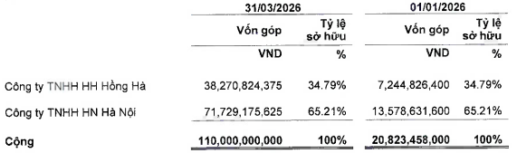 Trong quý 1/2026, NESC đã thực hiện tăng vốn thêm 89 tỷ đồng qua đó tăng vốn chủ sở hữu lên 102.8 tỷ đồng, cao gấp gần 8 lần so với đầu năm. Đáng chú ý, tỷ lệ sở hữu của hai cổ đông lớn là HN Hà Nội và HH Hồng Hà không thay đổi sau đợt tăng vốn, lần lượt duy trì ở mức 65.21% và 34.79%. Ngoài ra, quy mô nhân sự của Công ty tiếp tục được mở rộng với 20 nhân viên tại thời điểm cuối quý 1, tăng 6 người so với đầu năm.