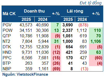 Nhìn chung, tình hình quý 4 giúp kết quả luỹ kế của nhóm nhiệt điện khả quan hơn. Kết năm 2025, PGV rực sáng với gần 3.7 ngàn tỷ đồng lợi nhuận ròng (cùng kỳ lỗ 878 tỷ), cao nhất 13 năm trở lại đây. NT2 lãi 1 ngàn tỷ đồng, gấp 11 lần cùng kỳ, góp phần giúp POW lãi hơn 2.3 ngàn tỷ, gấp 2.1 lần. QTP tăng lãi 70%, lãi vượt 1.05 ngàn tỷ đồng.
