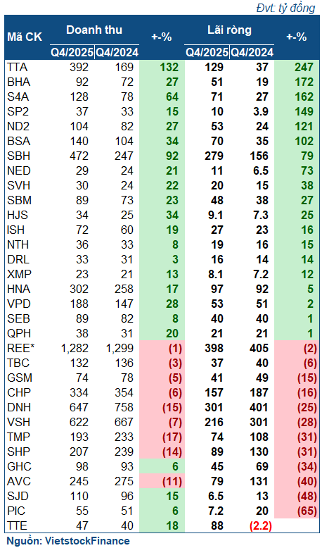 Thống kê từ VietstockFinance, trong số 58 doanh nghiệp ngành điện đã công bố BCTC quý 4/2025, có 38 đơn vị tăng trưởng lợi nhuận (4 chuyển lỗ thành lãi); 18 doanh nghiệp giảm lãi, và chỉ 2 cái tên thua lỗ.