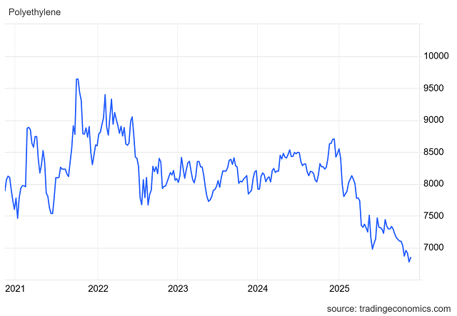 Giá hạt nhựa PE giảm liên tiếp trong năm 2025. Nguồn: tradingeconomics.com
