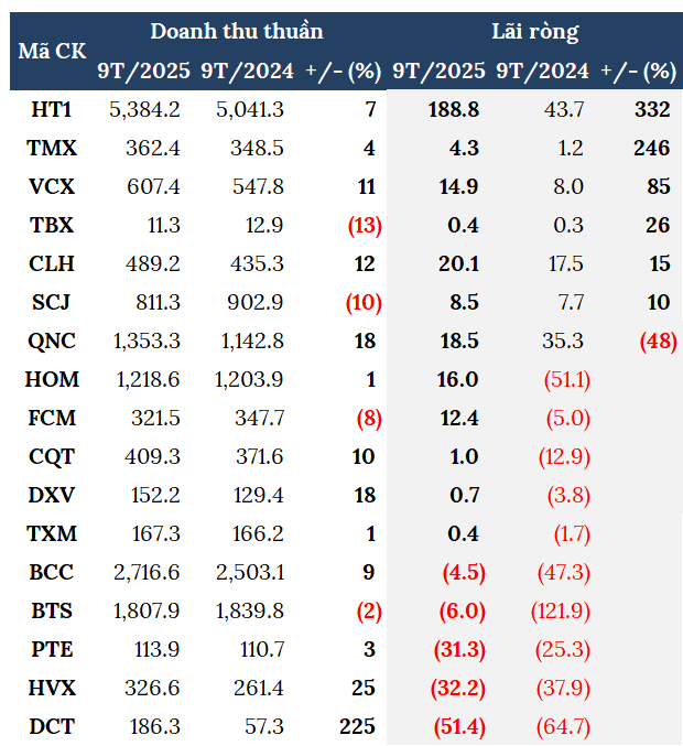 Ngoài HT1, VICEM Thương mại Xi măng (HNX: TMX) cũng bứt phá khi lãi hơn 3.5 tỷ đồng, gấp 45.5 lần cùng kỳ. TMX cho biết, đã thu hồi được hơn 4.7 tỷ đồng nợ khó đòi từ Công ty TNHH Vượng Anh, qua đó hoàn nhập dự phòng nợ phải thu. Sau 9 tháng, TMX lãi ròng hơn 4 tỷ đồng, tăng 3.5 lần và vượt xa chỉ tiêu năm.