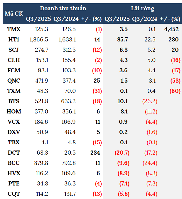 KQKD doanh nghiệp xi măng quý 3/2025 (Đvt: Tỷ đồng)