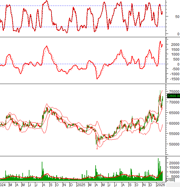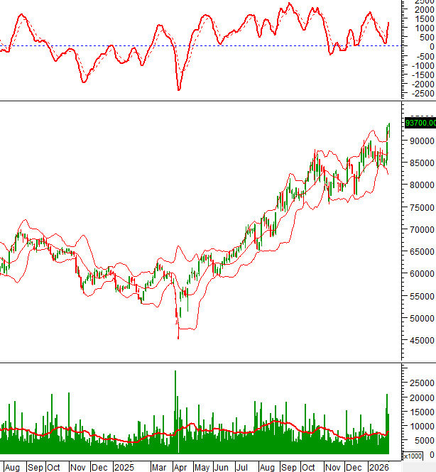 Giá đã vượt đường Middle và bám vào Upper Band của Bollinger Bands nên xu hướng ngắn hạn khá lạc quan.