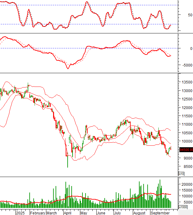 Chỉ báo MACD đã cho tín hiệu bán cuối tháng 09/2025 và rơi xuống dưới ngưỡng 0. Giá cũng đang nằm dưới SMA 50 ngày nên rủi ro khá lớn.
