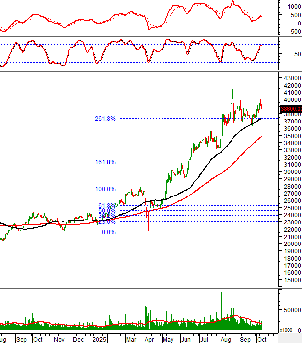 Giá cổ phiếu VIC giằng co mạnh trong phiên giao dịch ngày 08/10/2025 nhưng vẫn nằm trên ngưỡng Fibonacci Projection 161.8%.