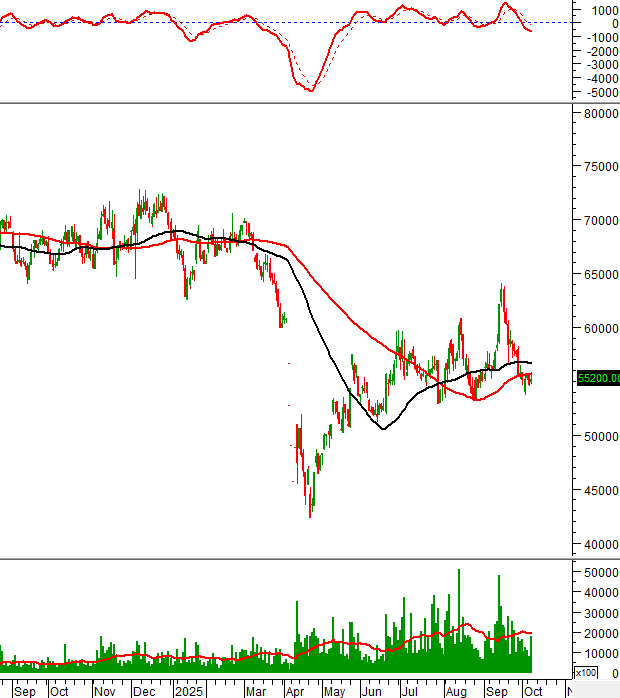 Giá cổ phiếu CTG hồi phục trong phiên giao dịch ngày 08/10/2025 dù đang test lại đỉnh cũ tháng 08/2025 (tương đương vùng 52,000-53,500).