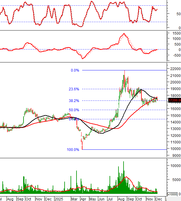 Giá cổ phiếu SHB giảm nhẹ trong phiên giao dịch ngày 08/12/2025 và tiếp tục test Fibonacci Retracement 23.6%.