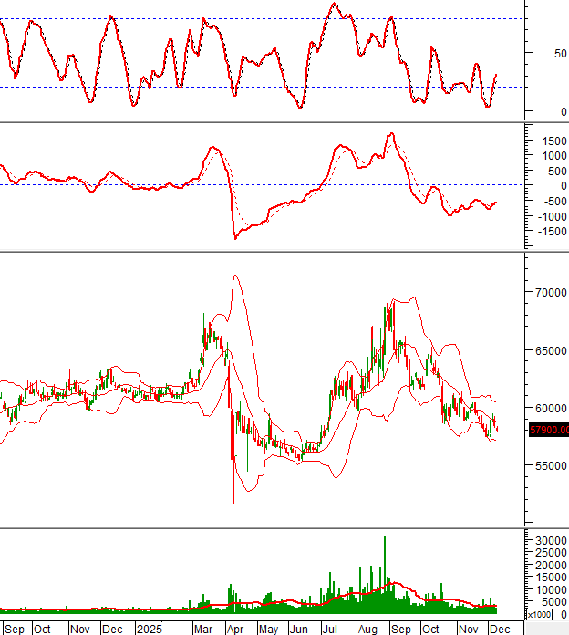 Giá cổ phiếu VCB tiếp tục giảm trong phiên giao dịch ngày 08/12/2025 sau khi test lại đường Middle của Bollinger Bands vào tuần trước.
