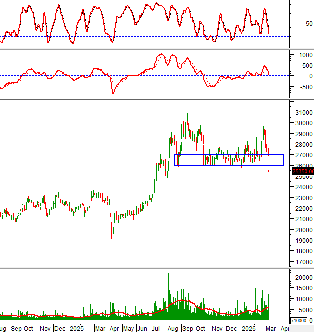Đáy cũ tháng 11/2025 (tương đương vùng 26,000-27,000) đã bị thủng nên rủi ro ngắn hạn tăng lên.