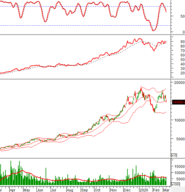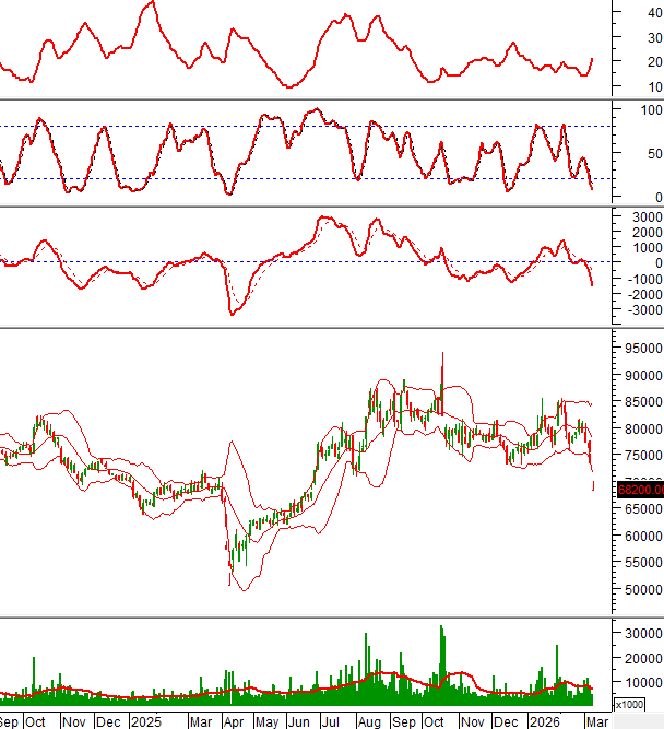 Giá đang bám vào Lower Band của Bollinger Bands nên rủi ro ngắn hạn gia tăng mạnh.