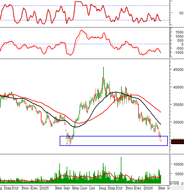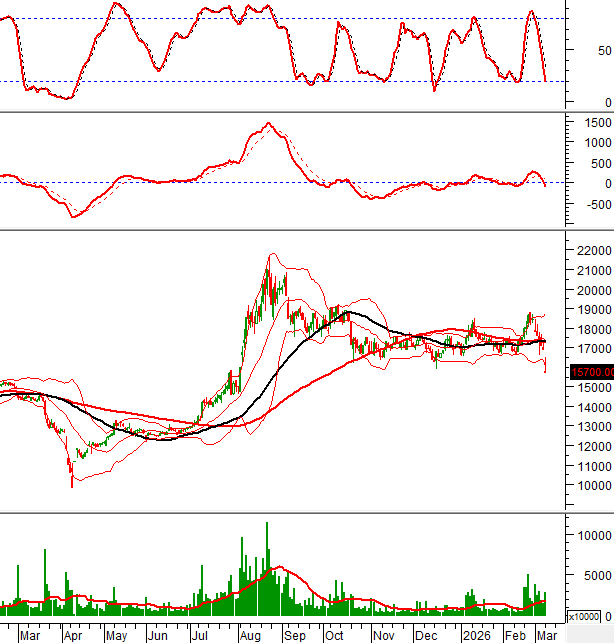 Giá đang bám sát Lower Band của Bollinger Bands và khối lượng sụt giảm xuống dưới mức trung bình 20 ngày.