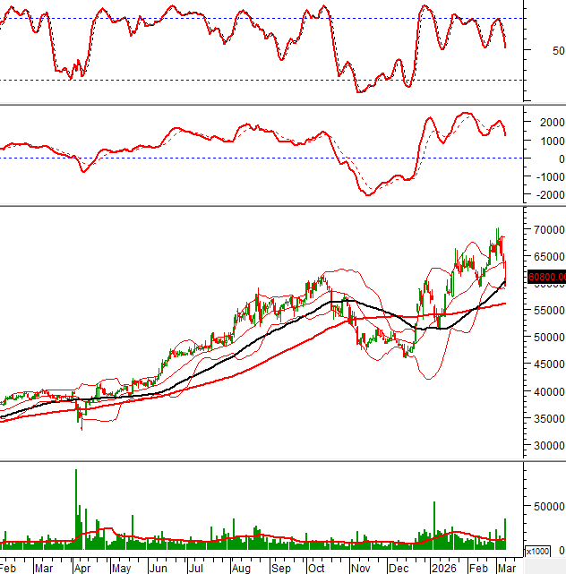 Trong phiên giao dịch ngày 09/03/2026, giá cổ phiếu VIC giảm mạnh và rơi xuống dưới đường Middle của Bollinger Bands.