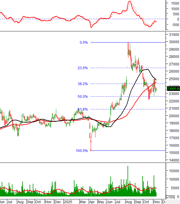 Hỗ trợ trong ngắn hạn là Fibonacci Retracement 50% và đáy cũ tháng 10/2025 (tương đương vùng 22,100-23,000).
