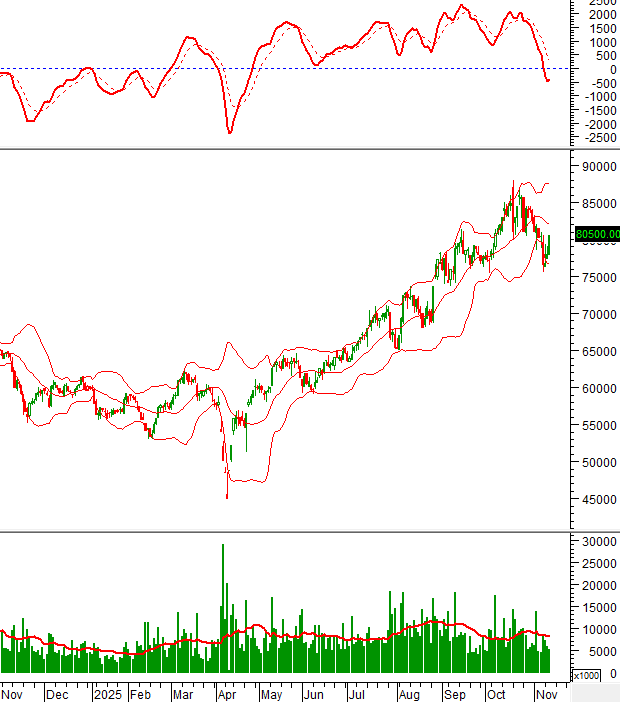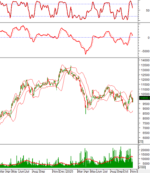 Giá cổ phiếu MWG tăng mạnh trong phiên giao dịch ngày 12/11/2025 và chuẩn bị test lại đường Middle của Bollinger Bands.