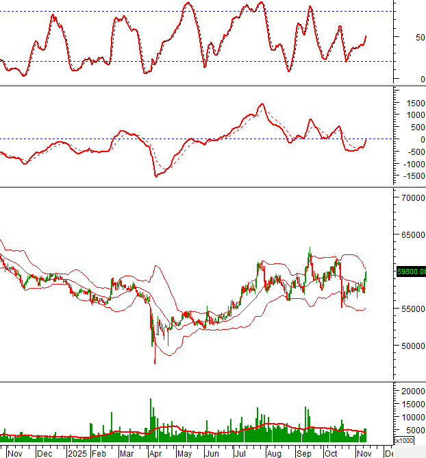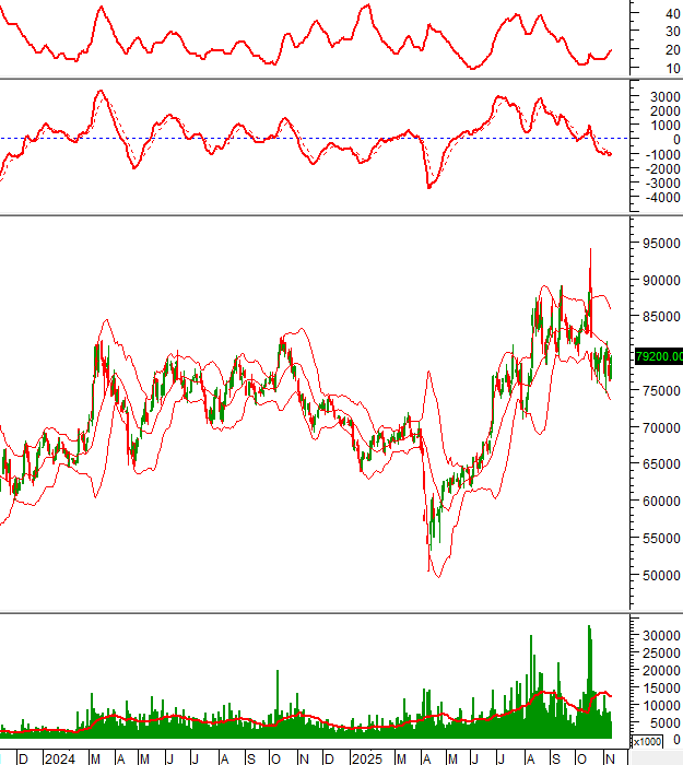 Giá đã phục hồi lên trên đường Middle của Bollinger Bands nên rủi ro giảm sâu được hạn chế.