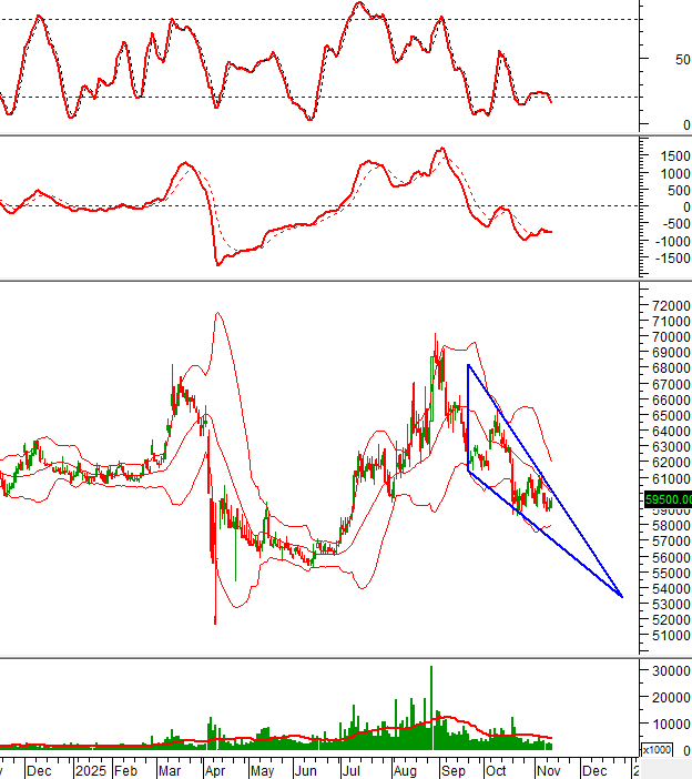 Trong phiên giao dịch ngày 12/11/2025, giá cổ phiếu VCB tăng nhẹ trở lại và hiện đang hình thành mẫu hình Falling Wedge.
