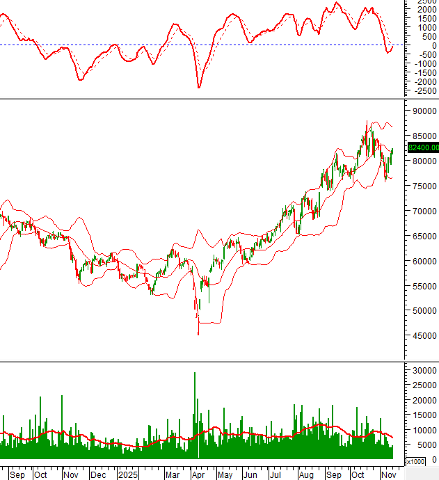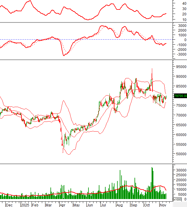 Giá đã vượt qua đường Middle của Bollinger Bands sau khi test thành công đáy cũ tháng 10/2025 (tương đương vùng 75,500-78,000).