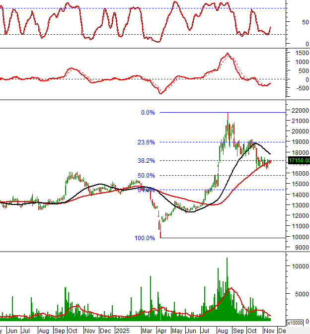 Giá cổ phiếu DPM tiếp tục đi lên trong phiên giao dịch ngày 17/11/2025 và chạm vào ngưỡng Fibonacci Retracement 38.2%.