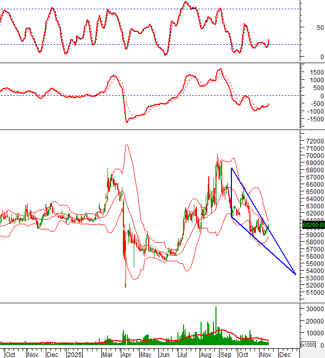 Trong phiên giao dịch ngày 17/11/2025, giá cổ phiếu VCB tăng nhẹ và hình thành mẫu hình Falling Wedge với mục tiêu 65,500-66,500.