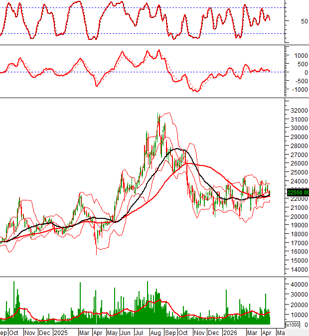 Giá đang chuẩn bị test lại đường Middle của Bollinger Bands và SMA 50 ngày. Kết quả test các ngưỡng này sẽ quyết định xu hướng trong thời gian tới.