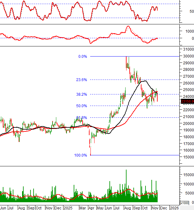Giá cổ phiếu DPM tiếp tục đi xuống trong phiên giao dịch ngày 24/11/2025 sau khi test ngưỡng Fibonacci Retracement 38.2%.