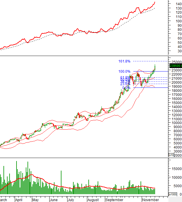 Giá đang bám vào Upper Band của Bollinger Bands và vượt qua đỉnh cũ tháng 10/2025 (tương đương vùng 220,000-226,500).