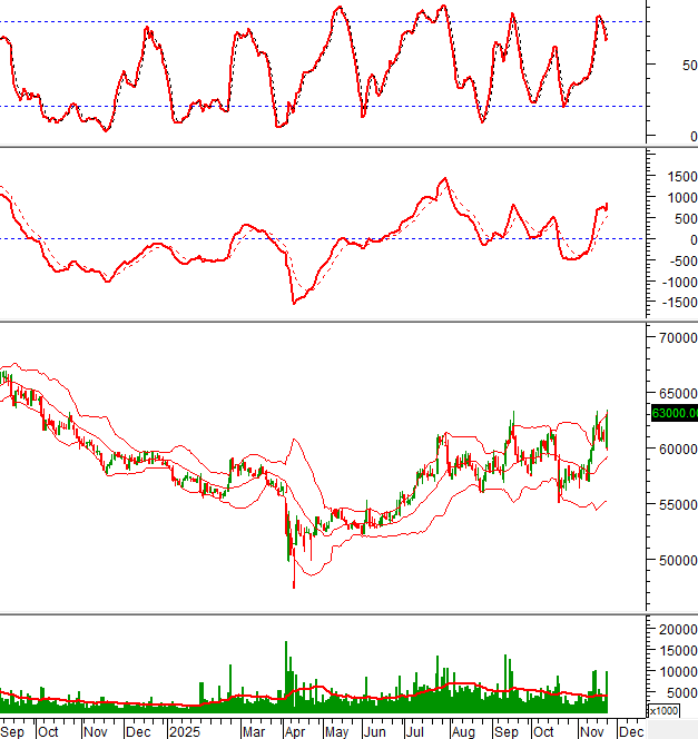 Chỉ số Relative Strength nằm trên mức trung bình 20 ngày từ đầu tháng 11/2025 cho thấy cổ phiếu này đang mạnh hơn (outperform) so với thị trường chung.