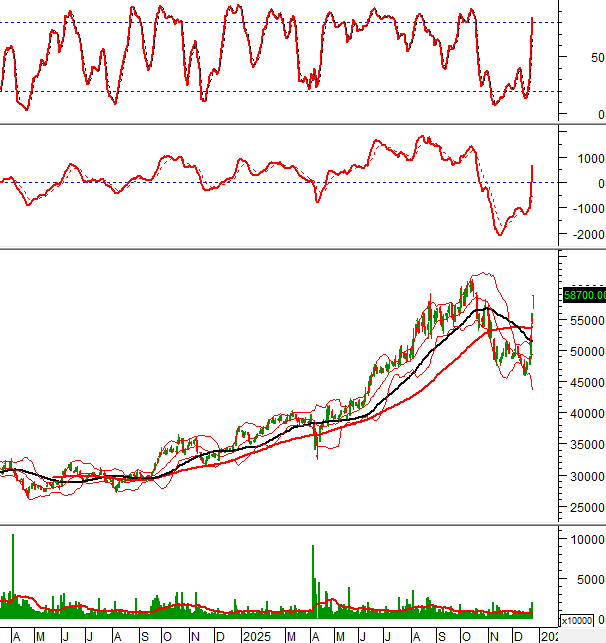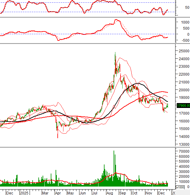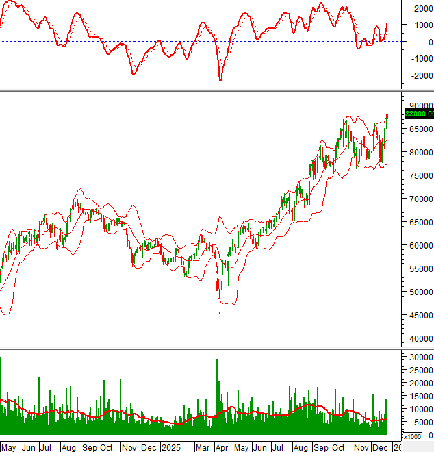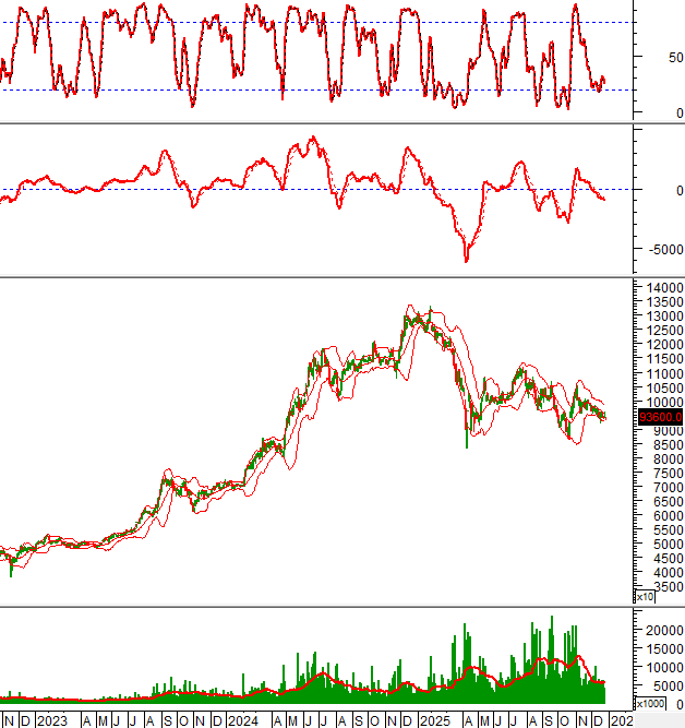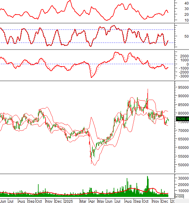 Giá chưa thể vượt qua đường Middle của Bollinger Bands dù đã test vài lần từ cuối tháng 11/2025 đến nay.