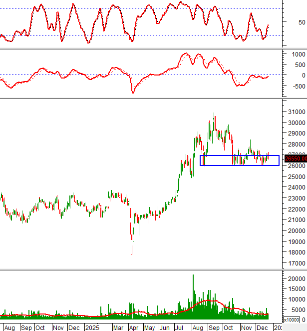 Đáy cũ tháng 10/2025 (tương đương vùng 26,000-27,000) đang đóng vai trò hỗ trợ mạnh. Việc mua vào trong vùng này được ủng hộ.