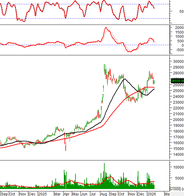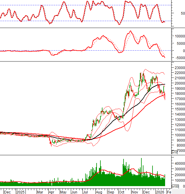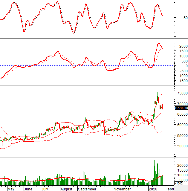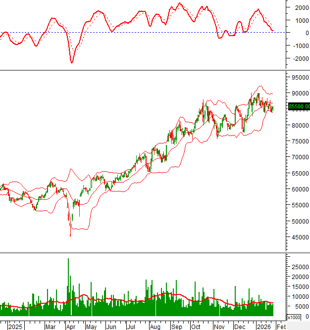 Trong phiên giao dịch ngày 28/01/2026, giá cổ phiếu VJC tiếp tục giảm và chạm vào Lower Band của Bollinger Bands.