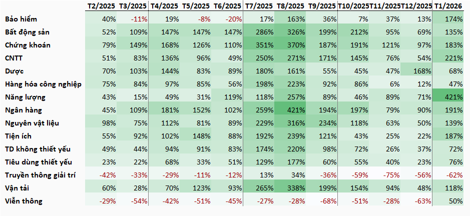 Tháng cuối năm Ất Tỵ (1/2026), dòng tiền hồi phục trở lại, nhóm năng lượng là tâm điểm chú ý chính. Ngoài ra, dòng tiền ở nhóm bảo hiểm, bất động sản, chứng khoán, công nghệ thông tin, ngân hàng, nguyên vật liệu, vận tải đồng loạt tăng.
